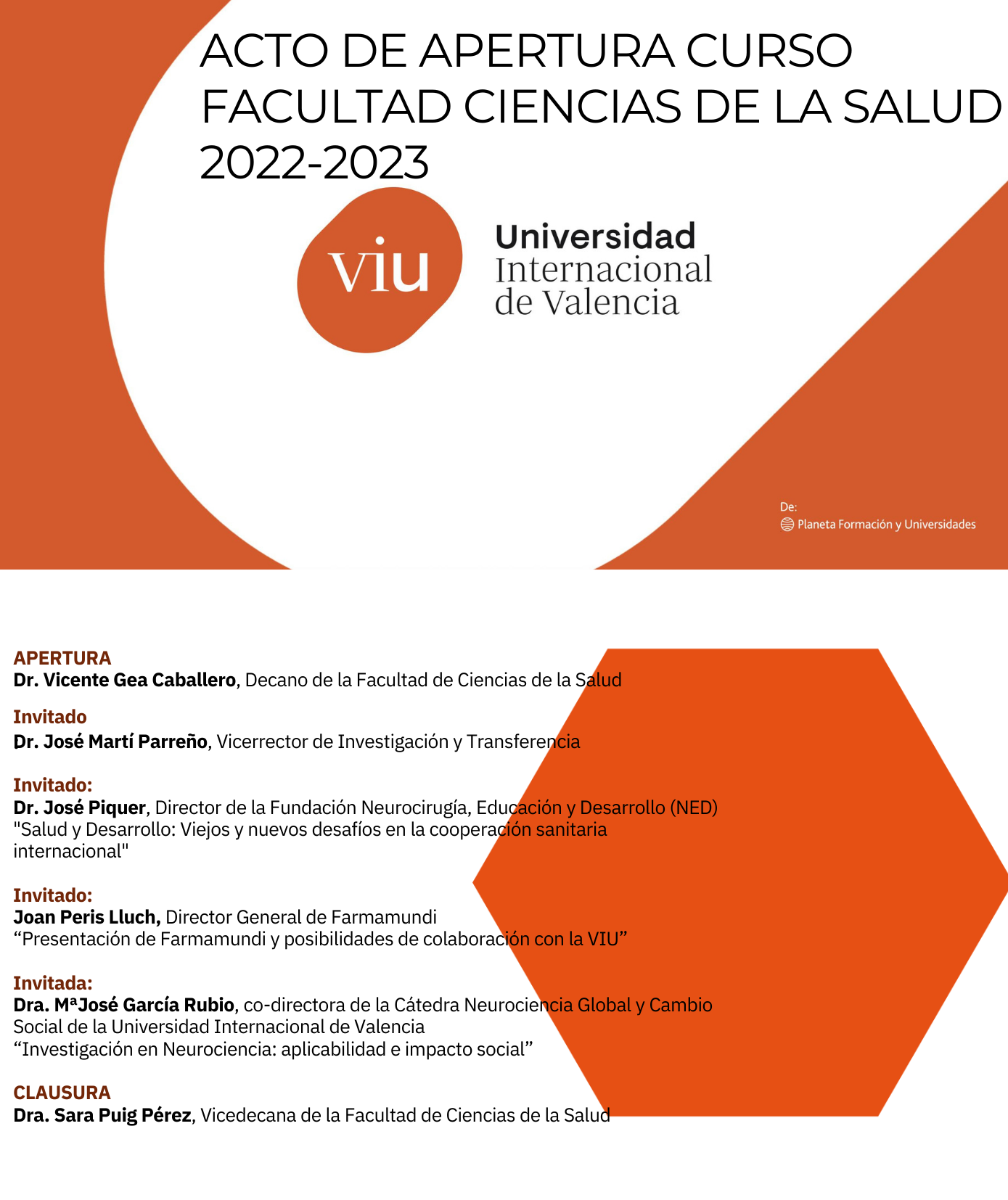 Entre los ponentes del curso más vinculados con la Cátedra VIU-NED, se encuentran el Dr. José Piquer Belloch, jefe de Servicio de Neurocirugía del H. Universitario de la Ribera, fundador de NED y codirector de la Cátedra de Neurociencia Global y Cambio Social; el Dr. Rubén Rodríguez, Neurocirujano Facultativo del mismo hospital y miembro de la comisión mixta de la Cátedra; la Dra. María José García Rubio, Neuropsicóloga, codirectora de la cátedra y PDI de la Facultad de Ciencias de la Salud de VIU; la Dra. Sara Puig, Vicedecana de profesorado de la Facultad de Ciencias de la Salud de VIU y miembro de la comisión mixta de la Cátedra; Dra. Arantxa Duque, directora del Grado en Psicología de la Universidad Internacional de Valencia, la Dra. Encarna Rama Galdón, experta en neurociencias y coordinadora del Grado en Psicología de VIU; y la Dra. Beatriz Vallés, directora del Grado en Logopedia de VIU y colaboradora activa en la cátedra.